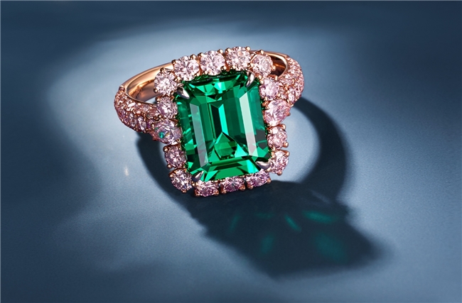 Diana戒指,18k玫瑰金与铂金镶嵌Muzo祖母绿、阿盖尔粉钻以及白钻,Photo:©轩灵珠宝官方